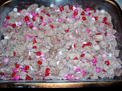 No I didn't forget today. It just ended up being a crazy day. Today I am sharing another recipe I found on Pinterest...Red Velvet Puppy Chow. I wasn't sure how it was going to taste using a cake mix, but it really is yummy. I didn't add the cream cheese and milk, since it has to be refrigerated if you do that and this in going into some care packages.