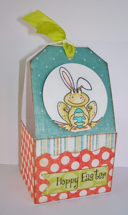 The box is an Inky Antics stamp that you stamp onto designer paper (tip: use a pale color so that the lines don't show on the inside), then cut, score, fold and glue together. I like using Mono Multi Liquid Glue so that I know it will STAY put together.